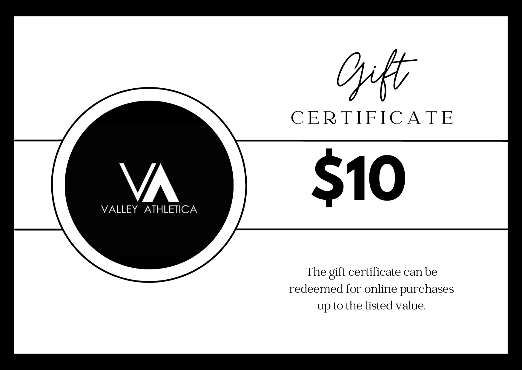 Valley Athletica Gift Certificate. Gift Certificate does not expire and can be used to purchase any store item.